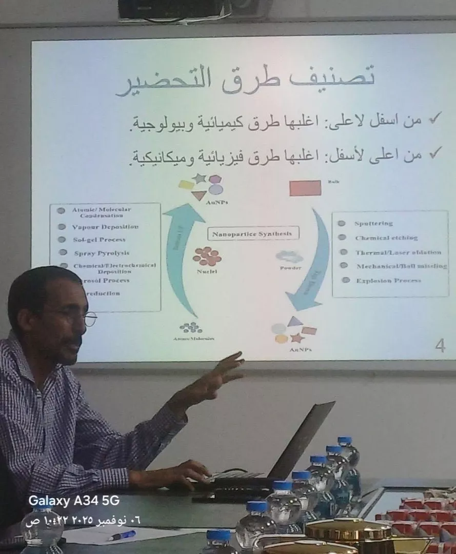في إطار التعاون العلمي بين كلية العلوم غريان وكليات العلوم المناظرة، وسعياً لزيادة الاهتمام بالعلوم والتقنيات الحديثة؛ ألقيت بكلية العلوم مصراتة صباح يوم الخميس الموافق 6 نوفمبر 2025م محاضرة علمية حول علم النانو، وذلك بقاعة الاجتماعات بمكتب البحوث والاستشارات الحيوية الكائن بكلية العلوم مصراتة